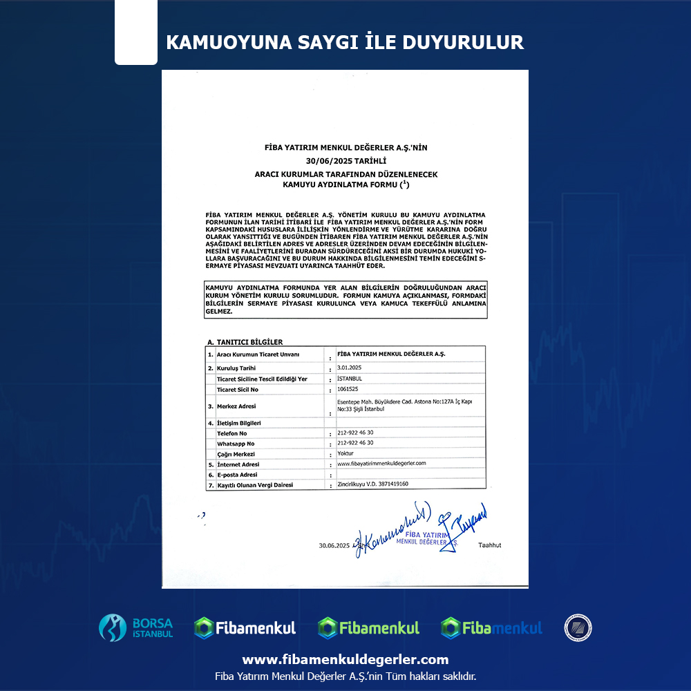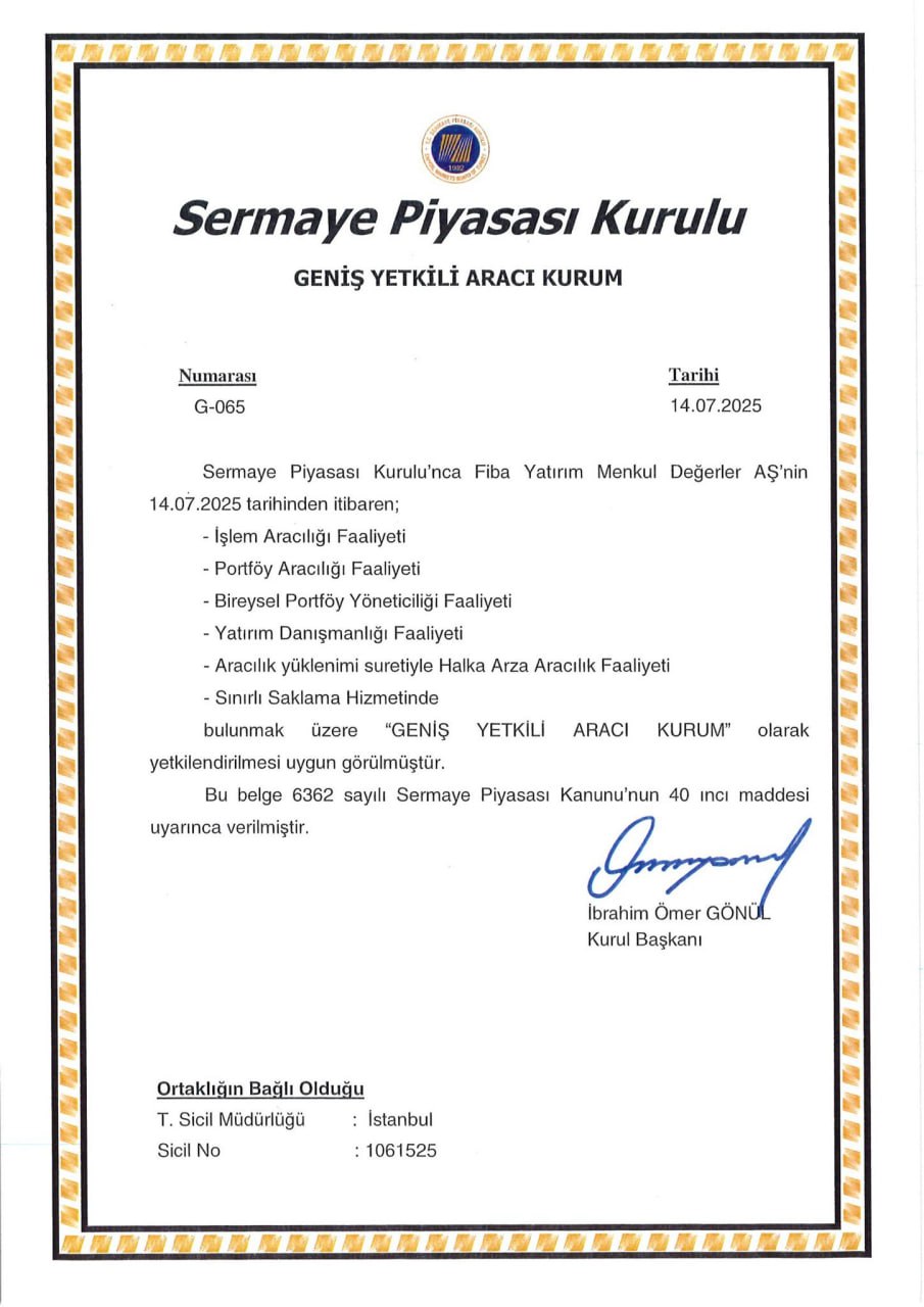 Hisse yatırımların için Fiba Menkul Değerler A.Ş., Sermaye Piyasası Kurulu (SPK) düzenlemelerine tabidir. Bu nedenle, müşteri tanıma (KYC – Know Your Customer) esasları gereği kimlik bilgilerinin doğrulanması zorunludur. Bu süreç, yatırımlarının güvenliğini sağlamak ve yasal mevzuata uyum göstermek amacıyla yapılır.